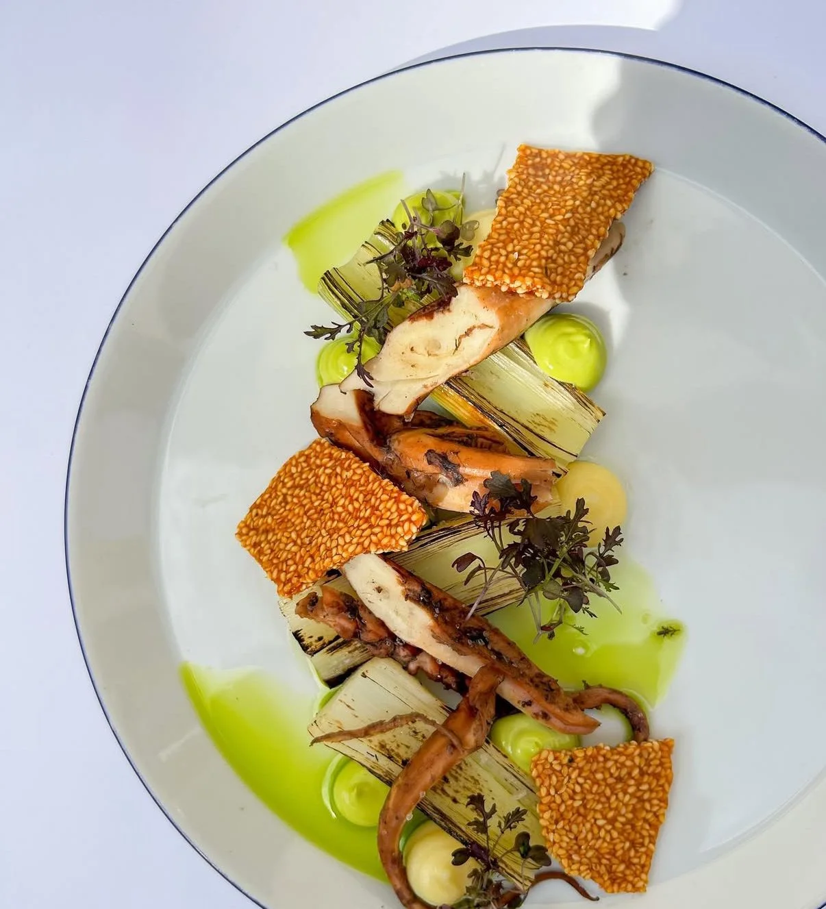 Sous-vide octopus, charred leeks, cilantro mayo, parsnip puree finished with sesame crackers